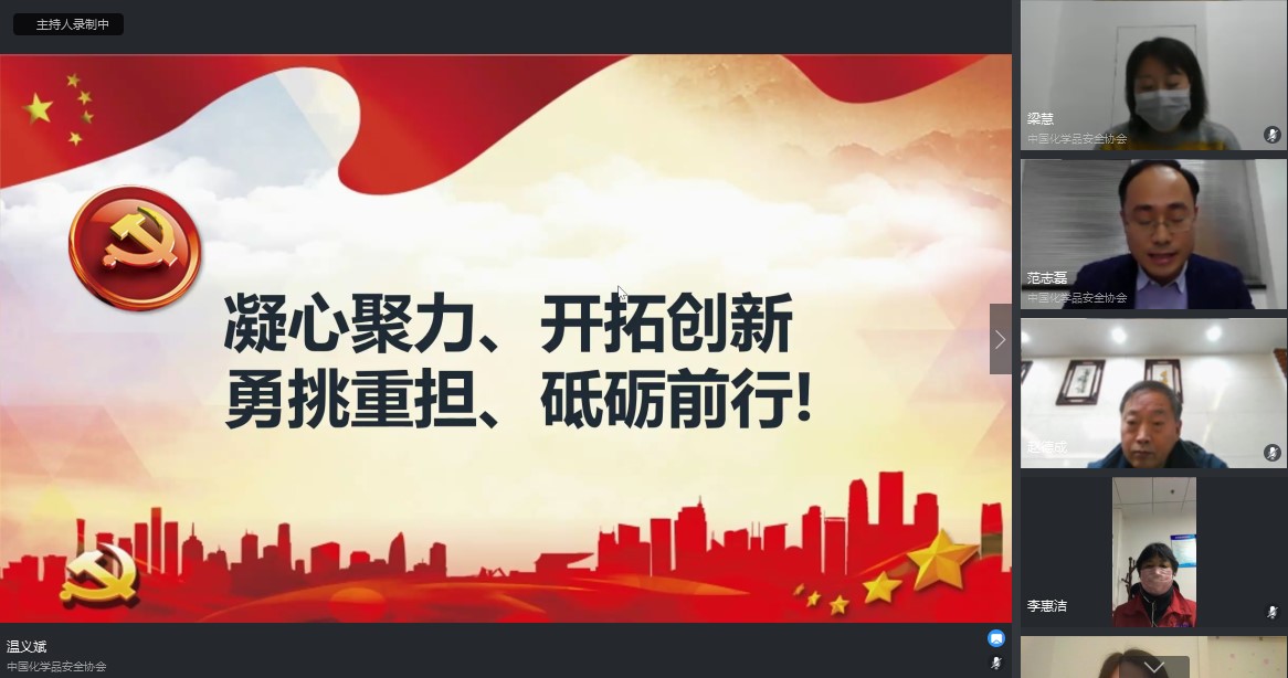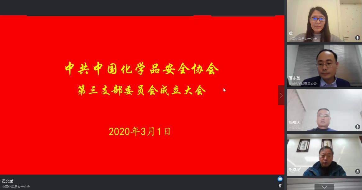 3月1日,中共中國(guó)化學(xué)品安全協(xié)會(huì)第三支部委員會(huì)成立大會(huì)通過釘釘視頻會(huì)議方式召開。中國(guó)化學(xué)品安全協(xié)會(huì)黨委書記路念明、副書記馬欣妮、組織委員方華云以及支部全體黨員等參加會(huì)議。會(huì)議由第三黨支部籌備小組組長(zhǎng)范志磊同志主持。