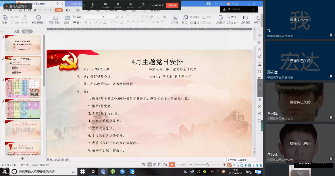 2020年4月10日,中國(guó)化學(xué)品安全協(xié)會(huì)第三黨支部以釘釘視頻會(huì)議形式開(kāi)展主題為“不忘政治初心 弘揚(yáng)奉獻(xiàn)精神”的4月主題黨日活動(dòng)。