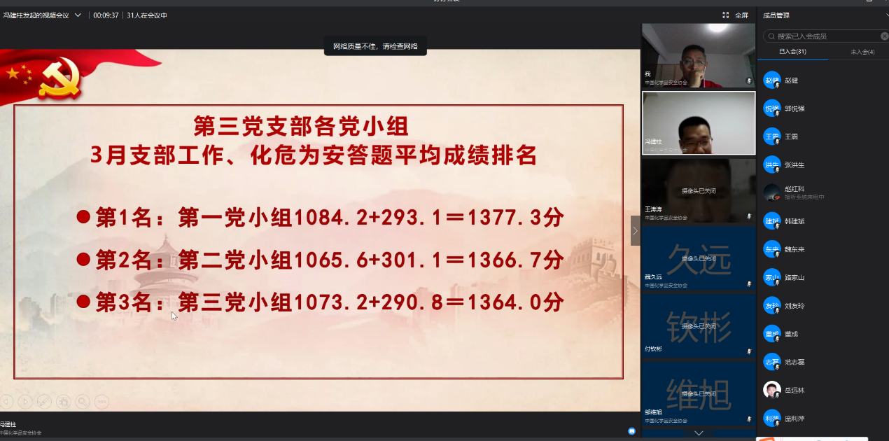 黨支部書記馮建柱同志通報了3月份支部工作APP和化危為安答題排名情況。第一黨小組3月份支部工作、微信答題綜合成績排名支部第一名,獲得本月優(yōu)秀黨小組流動紅旗。