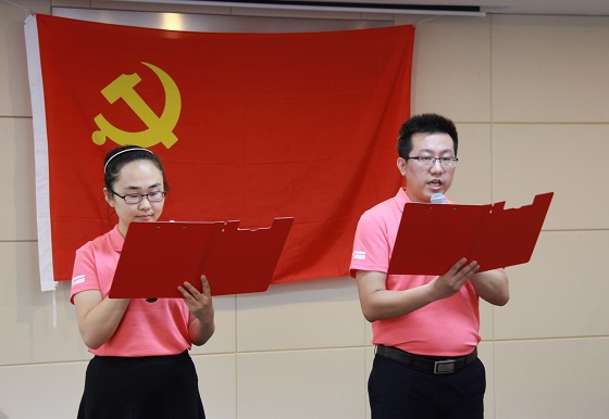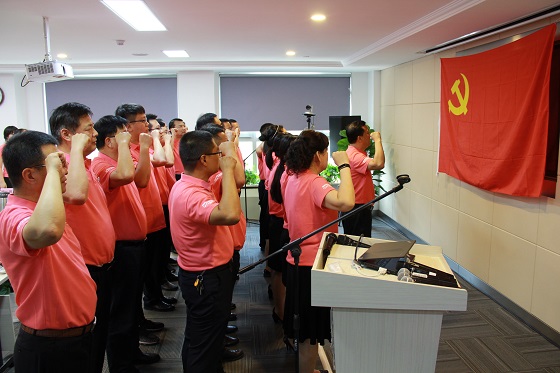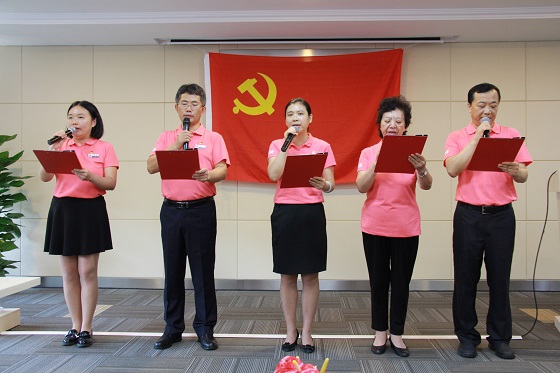 主題黨日活動現(xiàn)場簡樸莊重、氣氛熱烈濃厚,一面鮮艷的黨旗懸掛正中。下午3時(shí)許活動開始,參加活動的共產(chǎn)黨員身著紅色T恤,胸前佩戴黨徽,在支部書記路念明同志帶領(lǐng)下,大家舉起右手,面對黨旗,集體重溫入黨誓詞,在回顧往昔中感懷黨恩,在重溫誓詞中銘記宗旨,表達(dá)不忘初心、繼續(xù)前進(jìn)的堅(jiān)定信念。
