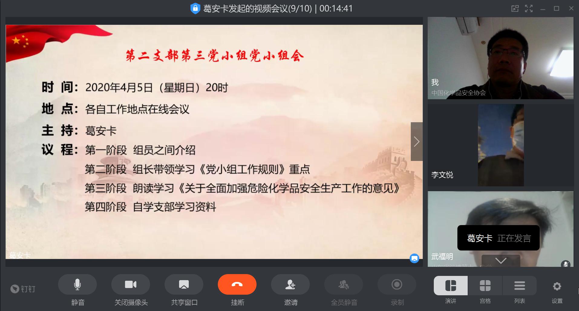 4月5日晚上8點(diǎn),中國化學(xué)品安全協(xié)會(huì)第二黨支部第三黨小組召開視頻學(xué)習(xí)會(huì)。會(huì)議由黨小組組長葛安卡同志主持,第三黨小組全體黨員參加了會(huì)議,第二黨支部書記馮建柱同志列席了會(huì)議。