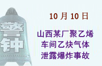 1999年10月10日,山西省某廠聚乙烯車間乙炔工段發(fā)生器內(nèi)乙炔氣泄漏,在加料過程中電石摩擦碰撞產(chǎn)生的火花引起爆炸,造成1人死亡。