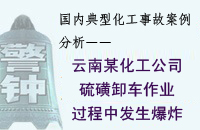 一、事故經(jīng)過(guò)和危害 2008年1月13日,云南省某化工公司三環(huán)分公司硫磺倉(cāng)庫(kù)發(fā)生爆炸,造成7人死亡、32人受傷。 1月13日2時(shí)45分,昆明市東站工商服務(wù)公司(鐵路運(yùn)輸裝卸承包單位)的