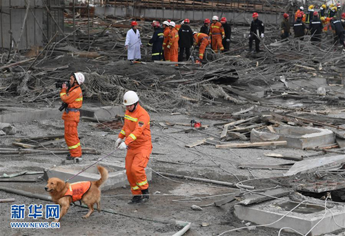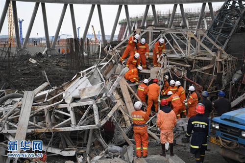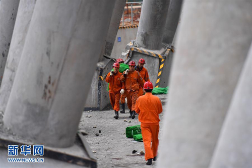 11月24日,救援人員在事故現(xiàn)場(chǎng)工作。當(dāng)日,江西省豐城電廠三期在建冷卻塔施工平臺(tái)發(fā)生倒塌事故。
