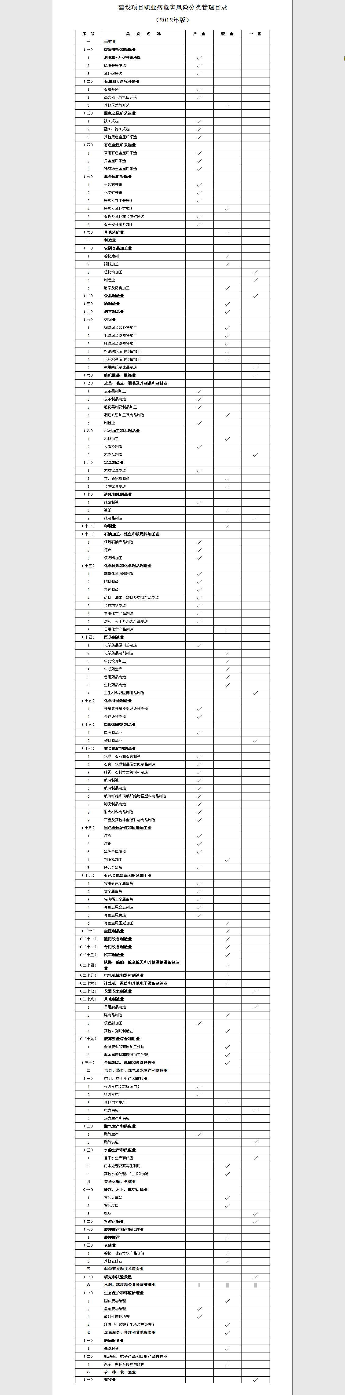 二、《目錄》是在綜合考慮《職業(yè)病危害因素分類目錄》所列各類職業(yè)病危害因素及其可能產(chǎn)生的職業(yè)病和建設(shè)項目可能產(chǎn)生職業(yè)病危害的風(fēng)險程度的基礎(chǔ)上,按照《國民經(jīng)濟(jì)行業(yè)分類》(GB/T 4754-2011),對可能存在職業(yè)病危害的主要行業(yè)進(jìn)行的分類?!赌夸洝酚蓢野踩O(jiān)管總局定期修訂公布。