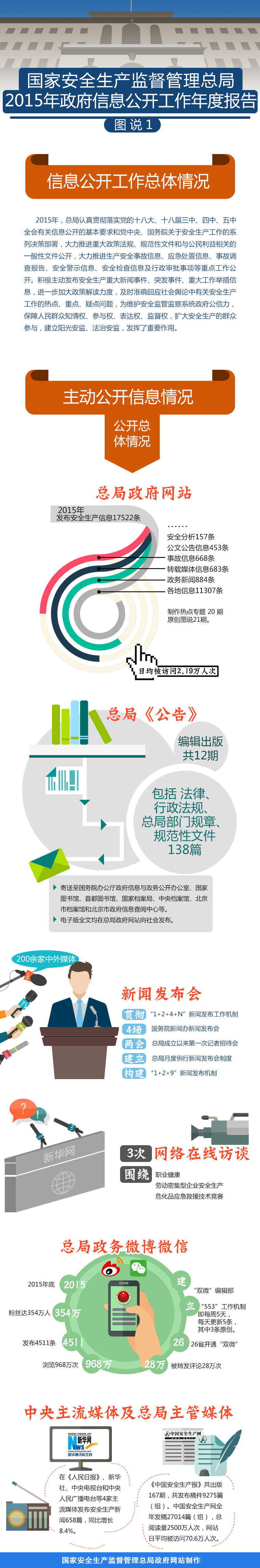 2015年, 總局認真貫徹落實黨的十八大、十八屆三中、四中、五中全會有關(guān)信息公開的基本要求和黨中央、國務院關(guān)于安全生產(chǎn)工作的系列決策部署,大力推進重大政策法 規(guī)、規(guī)范性文件和與公民利益相關(guān)的一般性文件公開,大力推進生產(chǎn)安全事故信息、應急處置信息、事故調(diào)查報告、安全警示信息、安全檢查信息及行政審批事項等 重點工作公開。積極主動發(fā)布安全生產(chǎn)重大新聞事件、突發(fā)事件、重大工作舉措信息,進一步加大政策解讀力度,及時準確回應社會輿論中有關(guān)安全生產(chǎn)工作的熱 點、重點、疑點問題,為維護安全監(jiān)管監(jiān)察系統(tǒng)政府公信力,保障人民群眾知情權(quán)、參與權(quán)、表達權(quán)、監(jiān)督權(quán),擴大安全生產(chǎn)的群眾參與,建立陽光安監(jiān)、法治安 監(jiān),發(fā)揮了重要作用。