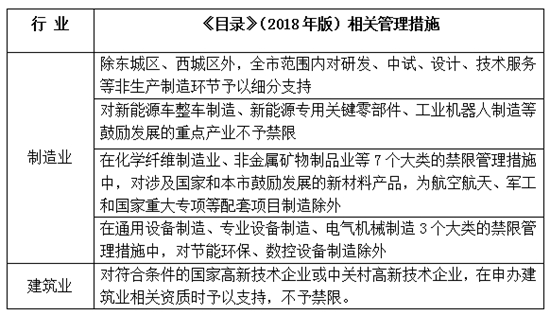 例如,在制造業(yè)中,除東城區(qū)、西城區(qū)外,全市范圍內(nèi)對研發(fā)、中試、設(shè)計、技術(shù)服務(wù)等非生產(chǎn)制造環(huán)節(jié)予以細分支持;對新能源車整車制造、新能源專用關(guān)鍵零部件、工業(yè)機器人制造等鼓勵發(fā)展的重點產(chǎn)業(yè)不予禁限;在化學(xué)纖維制造等7個大類的禁限管理措施中,對涉及國家和本市鼓勵發(fā)展的新材料產(chǎn)品,為航空航天、軍工和國家重大專項等配套項目予以除外,不予禁限;對符合條件的國家高新技術(shù)企業(yè)或中關(guān)村高新技術(shù)企業(yè),在申辦建筑業(yè)相關(guān)資質(zhì)時予以支持,不予禁限。