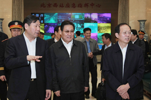 趙鐵錘在北京西客站開展調研督導工作,并與鐵道部副部長胡亞東就有關工作交換意見。