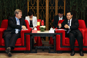 | 與會嘉賓共同按下項目啟動按鈕,中歐合作項目正式啟動。 | 9月20日,孫華山會見了歐盟就業(yè)、社會事務(wù)和機(jī)會均等總司長古斯•蕾切爾一行。 |
