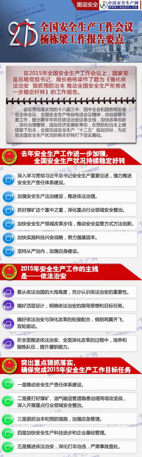 楊棟梁提出,2015年要突出抓好五項(xiàng)重點(diǎn)工作:一是推動(dòng)安全生產(chǎn)責(zé)任體系建設(shè);二是要打好煤礦、油氣輸送管道隱患治理兩場(chǎng)攻堅(jiān)戰(zhàn),深入開(kāi)展重點(diǎn)行業(yè)領(lǐng)域安全整治;三是狠抓治本和預(yù)防措施,加強(qiáng)應(yīng)急管理;四是加快安全生產(chǎn)科技進(jìn)步和企業(yè)基礎(chǔ)管理;五是推進(jìn)依法治安,深化打非治違,嚴(yán)肅事故查處。
