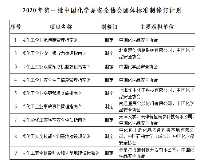4月7日,中國化學(xué)品安全協(xié)會印發(fā)2020年第一批團(tuán)體標(biāo)準(zhǔn)項目計劃,共9項標(biāo)準(zhǔn),計劃在今年底前完成標(biāo)準(zhǔn)發(fā)布工作。