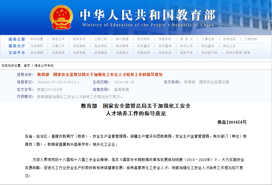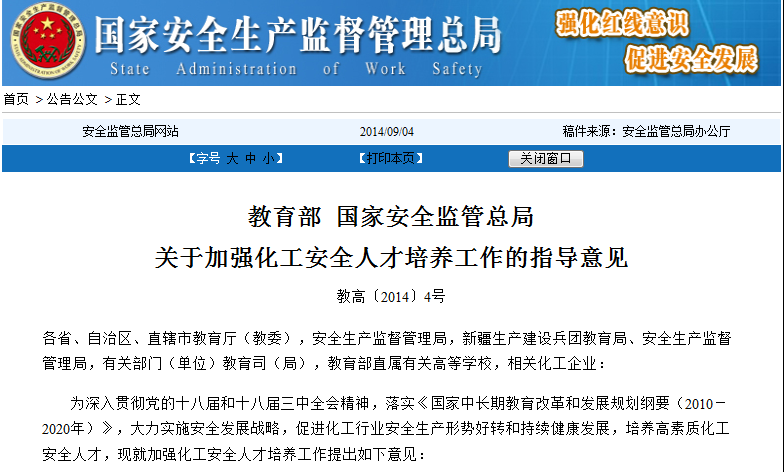 《教育部、國家安全監(jiān)管總局關(guān)于加強(qiáng)化工安全人才培養(yǎng)工作的指導(dǎo)意見》(教高〔2014〕4號(hào))