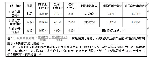 “長(zhǎng)航江寧”輪在減速準(zhǔn)備錨泊前突遇強(qiáng)風(fēng)暴雨并受到較大的影響,船長(zhǎng)采取了穩(wěn)船操作措施,也有受強(qiáng)風(fēng)暴雨作用出現(xiàn)下漂、后退的航跡,船位一直在附近水域上下游弋。但其受風(fēng)面為貫穿通透式,實(shí)際排水量是“東方之星”輪的3.3倍,吃水比“東方之星”輪深0.49米,“長(zhǎng)航江寧”輪的核定航區(qū)為A級(jí),在B級(jí)航區(qū)遭受33.35米/秒(12級(jí))橫風(fēng)時(shí),喪失穩(wěn)性,而“東方之星”輪的核定航區(qū)為B級(jí),在遭受21.52米/秒(9級(jí))橫風(fēng)時(shí),即喪失穩(wěn)性。