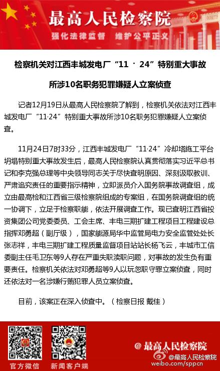 據(jù)最高人民檢察院微博消息,檢察機關(guān)已依法對江西豐城發(fā)電廠“11·24”特別重大事故所涉10名職務犯罪嫌疑人立案偵查。