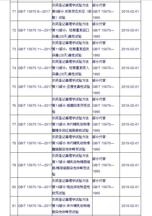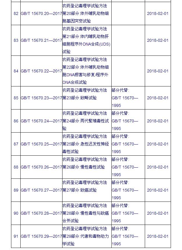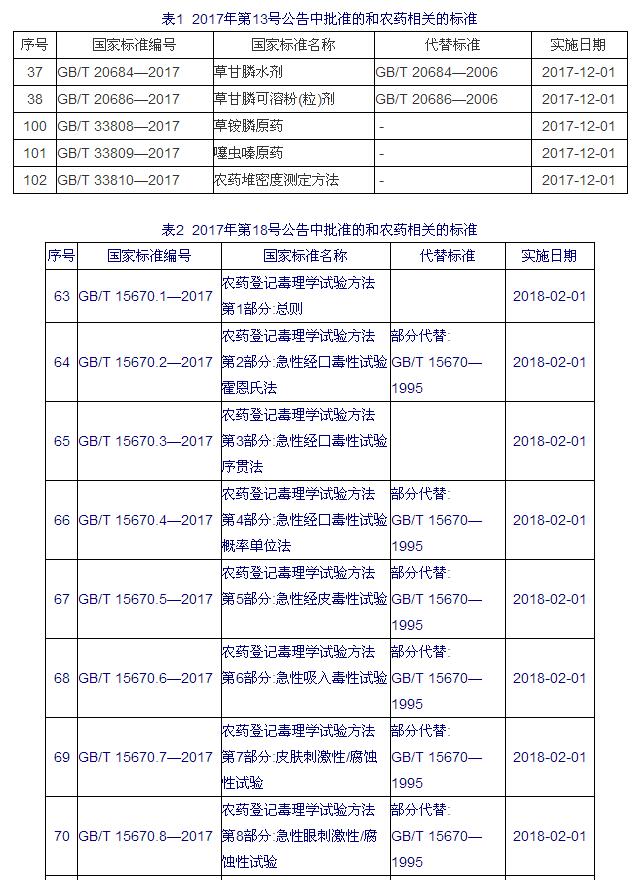 其中,2017年第13號公告(關(guān)于批準發(fā)布《充氣輪胎物理性能試驗方法》等155項國家標準的公告)中,新批準的和農(nóng)藥相關(guān)的標準有5個;2017年第18號公告(關(guān)于批準發(fā)布《開槽平端緊定螺釘》等312項國家標準的公告)中,新批準的和農(nóng)藥相關(guān)的標準有29個。分別見表1和表2。