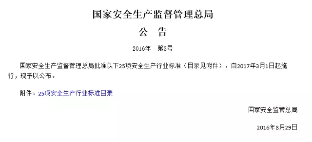 國家安全生產(chǎn)監(jiān)督管理總局于8月29號發(fā)文公布,批準(zhǔn)以下25項(xiàng)安全生產(chǎn)行業(yè)標(biāo)準(zhǔn)目錄,自2017年3月1日起施行,詳情如下。