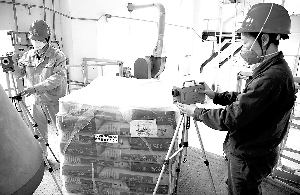圖為8月12日,該公司技術(shù)監(jiān)測(cè)人員正在樹脂聯(lián)合車間粉塵檢測(cè)點(diǎn)監(jiān)測(cè)。 (彭展 攝)