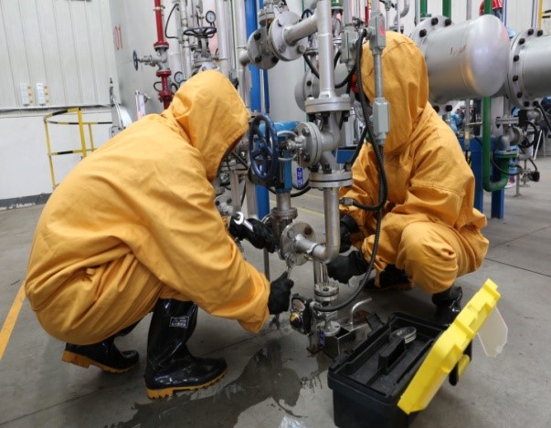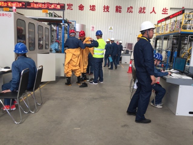 C項(xiàng)目為“?;钒踩a(chǎn)作業(yè)檢修操作”??己瞬捎皿w感式半實(shí)物仿真工廠裝置,局部以水和低壓空壓氣為替代物料,工藝數(shù)據(jù)以O(shè)TS進(jìn)行參數(shù)模擬。要求三位選手相互配合在規(guī)定的時(shí)間內(nèi)完成操作。選手完成操作后由計(jì)算機(jī)自動(dòng)評(píng)分和裁判現(xiàn)場(chǎng)評(píng)分相結(jié)合給出最終成績(jī)。