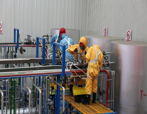 B項(xiàng)目為“多種?;飞a(chǎn)工藝安全操作”。三名選手按照工廠角色分別扮演班長(zhǎng)、內(nèi)操、外操進(jìn)行內(nèi)外操協(xié)同作業(yè)??己瞬捎冒雽?shí)物仿真工廠實(shí)際操作考核方式,裝置內(nèi)部不走物料,工作過(guò)程按選擇的危險(xiǎn)化工工藝和介質(zhì)進(jìn)行OTS(Operator Training System)參數(shù)模擬。要求三位選手相互配合在規(guī)定的時(shí)間內(nèi)完成操作。選手完成操作后,結(jié)合計(jì)算機(jī)自動(dòng)評(píng)分和裁判現(xiàn)場(chǎng)評(píng)分給出最終成績(jī)。