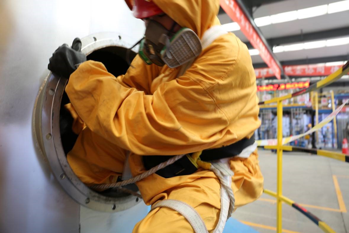 ?;钒踩a(chǎn)作業(yè)檢修操作裝置的具體考核內(nèi)容分為三個(gè)部分:一是應(yīng)急搶修作業(yè)考核,應(yīng)急搶修作業(yè)亦稱非計(jì)劃性檢修作業(yè)考核,共有四個(gè)事故,分別為法蘭墊片乙酸乙酯泄漏應(yīng)急作業(yè)考核、管道乙酸乙酯物質(zhì)泄漏應(yīng)急作業(yè)考核、法蘭墊片氰化鈉溶液泄漏應(yīng)急作業(yè)考核、管道氰化鈉溶液泄漏應(yīng)急作業(yè)考核,在競(jìng)賽中隨機(jī)考核一個(gè)事故;二是計(jì)劃性檢修作業(yè)考核,包含了在計(jì)劃性檢修過(guò)程中最常見(jiàn)的動(dòng)火作業(yè)、受限空間作業(yè)、高處作業(yè)、臨時(shí)用電作業(yè)、盲板抽堵作業(yè)五大特殊作業(yè)的整個(gè)作業(yè)流程,在競(jìng)賽中隨機(jī)考核一個(gè)流程;三是安全文明生產(chǎn),主要是對(duì)參賽選手在作業(yè)過(guò)程中的規(guī)范操作、安全作業(yè)以及現(xiàn)場(chǎng)紀(jì)律方面的評(píng)判。圖5為C項(xiàng)目競(jìng)賽現(xiàn)場(chǎng)。