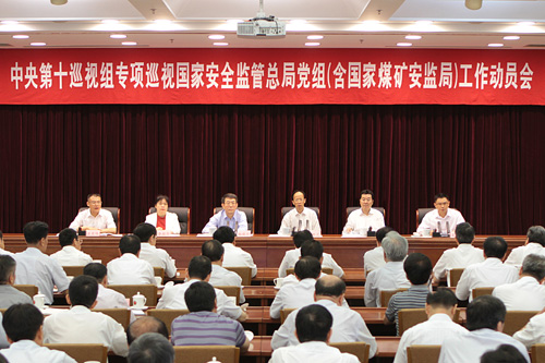 根據(jù)中央統(tǒng)一部署,2016年6月30日上午, 中央第十巡視組專項(xiàng)巡視國(guó)家安全生產(chǎn)監(jiān)督管理總局黨組(含國(guó)家煤礦安全監(jiān)察局)工作動(dòng)員會(huì)召開(kāi)。會(huì)前,中央巡視工作領(lǐng)導(dǎo)小組辦公室負(fù)責(zé)同志向國(guó)家安全生產(chǎn) 監(jiān)督管理總局黨組書(shū)記、局長(zhǎng)楊煥寧傳達(dá)了習(xí)近平總書(shū)記關(guān)于巡視工作的重要講話精神。會(huì)上,中央第十巡視組組長(zhǎng)胡新元就即將開(kāi)展的專項(xiàng)巡視工作作了講話,中 央巡視工作領(lǐng)導(dǎo)小組辦公室有關(guān)負(fù)責(zé)同志就配合做好巡視工作提出要求,楊煥寧主持會(huì)議并作表態(tài)發(fā)言。中央第十巡視組副組長(zhǎng)李桂華、張汝杰、王東偉及巡視組全體成員,國(guó)家安全生產(chǎn)監(jiān)督管理總局黨組成員、國(guó)家煤礦安監(jiān)局領(lǐng)導(dǎo)班子成員出席會(huì)議,近年退出領(lǐng)導(dǎo)崗位 的老領(lǐng)導(dǎo)、機(jī)關(guān)各司局副司級(jí)以上干部、應(yīng)急指揮中心部門(mén)副主任以上干部、在京直屬事業(yè)單位黨政主要負(fù)責(zé)人、社團(tuán)組織秘書(shū)長(zhǎng)等列席會(huì)議。各省級(jí)煤礦安監(jiān)局和 各駐地煤礦安全監(jiān)察分局處長(zhǎng)以上干部在分會(huì)場(chǎng)列席會(huì)議。