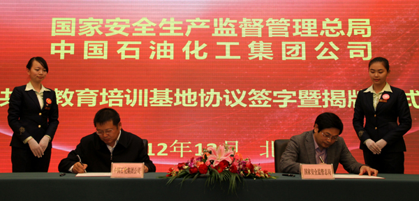 12月14日,國家安全監(jiān)管總局和中國石化集團(tuán)公司共建教育培訓(xùn)基地合作協(xié)議簽字暨揭牌儀式在京舉行。國家安全監(jiān)管總局副局長孫華山出席簽字儀式,代表國家安全監(jiān)管總局與中國石化集團(tuán)公司高級副總裁章建華在合作協(xié)議上簽字,并為“國家安全監(jiān)管總局教育培訓(xùn)基地”揭牌。