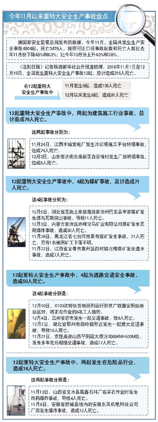 記者根據(jù)新華社公開報道梳理,11月1日至12月16日,全國共發(fā)生重特大安全生產(chǎn)事故12起,總計造成216人死亡。