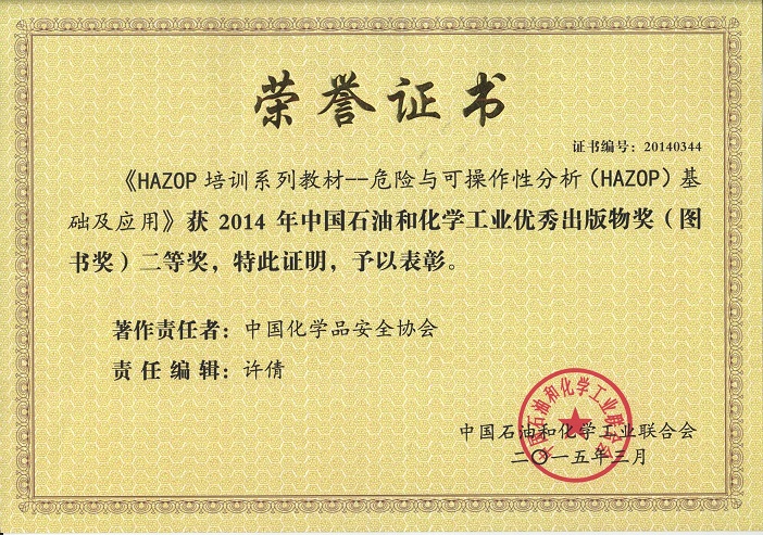 近日,由中國(guó)化學(xué)品安全協(xié)會(huì)組織編寫的HAZOP培訓(xùn)系列教材——《危險(xiǎn)與可操作性分析(HAZOP)基礎(chǔ)及應(yīng)用》(普及教材)和《危險(xiǎn)與可操作性分析(HAZOP)應(yīng)用指南》(專業(yè)教材)在2014年中國(guó)石油和化學(xué)工業(yè)優(yōu)秀出版物(圖書獎(jiǎng))評(píng)選中,榮獲二等獎(jiǎng)。