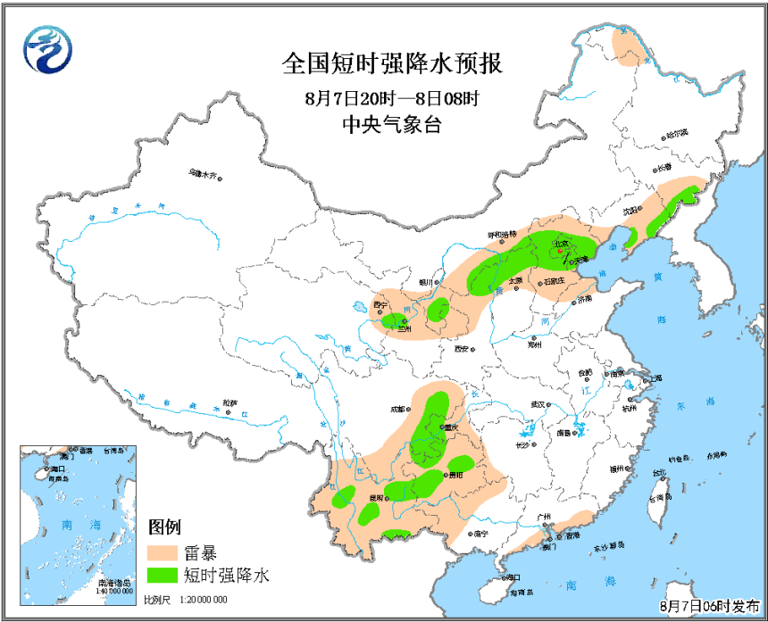 預(yù)計8月7日08時至8日08時,內(nèi)蒙古中南部、吉林東部、遼寧中東部、青海東部、甘肅東南部、寧夏中南部、陜西北部、山西中北部、河北中北部、北京、天津、湖南中西部、浙江南部、四川東部、重慶、貴州、云南、廣西北部、廣東南部等地的部分地區(qū)將有短時強降水天氣,小時雨強20-50毫米,局地可達 60毫米以上;另外,陜西北部和山西北部等地的局地將有雷暴大風(fēng)或冰雹天氣。強對流天氣:目前是指伴隨雷暴現(xiàn)象的對流性大風(fēng)(≥17.2m/s)、冰雹、短時強降水。