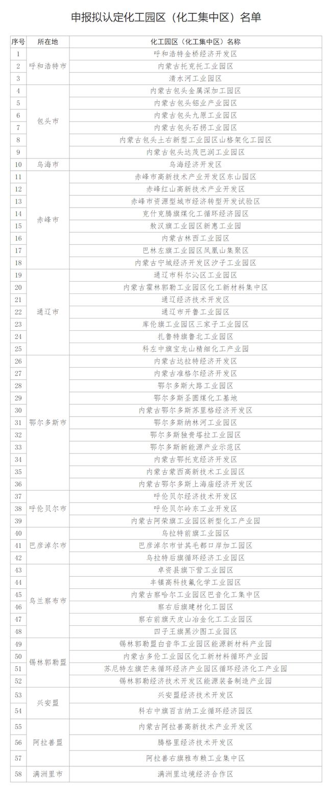 近日,內(nèi)蒙古自治區(qū)工信廳公示擬認(rèn)定的化工園區(qū)(化工集中區(qū))的名單,13個盟市58個園區(qū)入選。 根據(jù)公示,鄂爾多斯市有11家;赤峰有8家;通遼市有7家;包頭市和烏蘭察布市均有6家;錫林郭勒盟有4家;呼和浩特市、呼倫貝爾市、巴彥淖爾市、阿拉善盟均為3家。