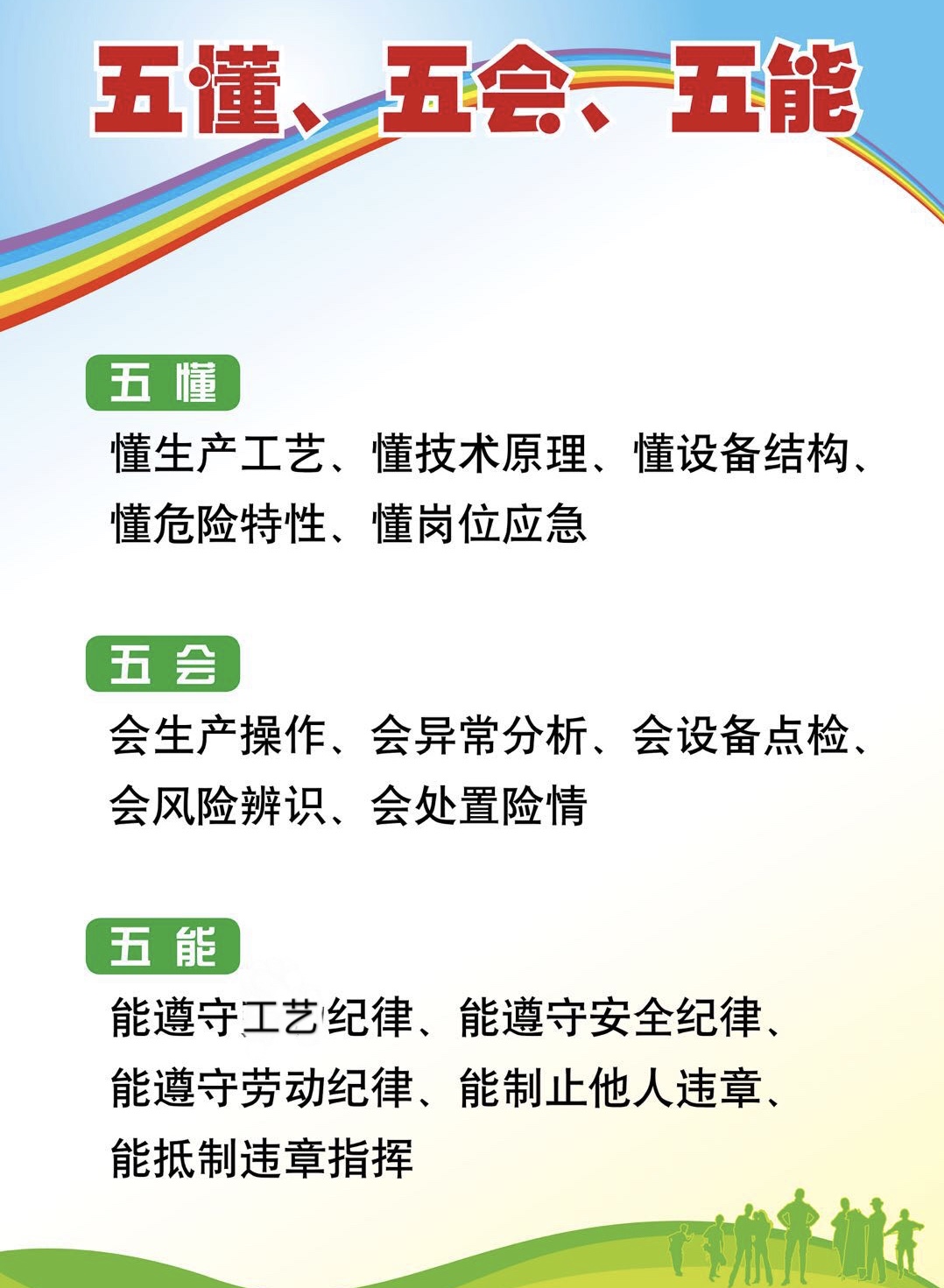 一是要提高對(duì)五懂五會(huì)五能內(nèi)容的理解和認(rèn)識(shí)。有人會(huì)認(rèn)為,如果讓員工都達(dá)到五懂五會(huì)五能,那員工不就成了專家嗎。是的,五懂五會(huì)五能是對(duì)員工在崗位安全生產(chǎn)履責(zé)應(yīng)知應(yīng)會(huì)上提出的目標(biāo)與任務(wù),首先要定位在積極努力的思想和方向上。山因勢(shì)而變、水因域而變、人因思而變。利劍常常敗于思想。