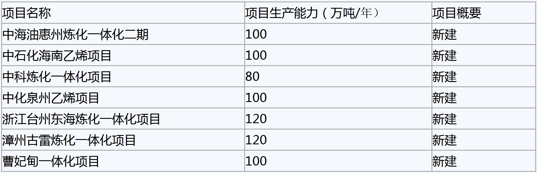 “十三五”規(guī)劃期間我國將建成投產(chǎn)的“大乙烯”項目