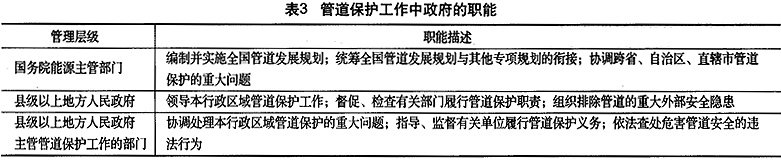 政府及相關(guān)部門是管道保護的行政管理主體,對管道保護工作主要履行監(jiān)管職能(見表3)。