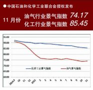 油氣行業(yè)和化工行業(yè)景氣指數(shù)走勢(shì)圖 最新數(shù)據(jù)顯示,2015年11月份,我國(guó)油氣行業(yè)景氣指數(shù)止跌回升,化工行業(yè)景氣指數(shù)繼續(xù)下降。油氣行業(yè)景氣指數(shù)為74.17(2004年=100,下同),比上月上升